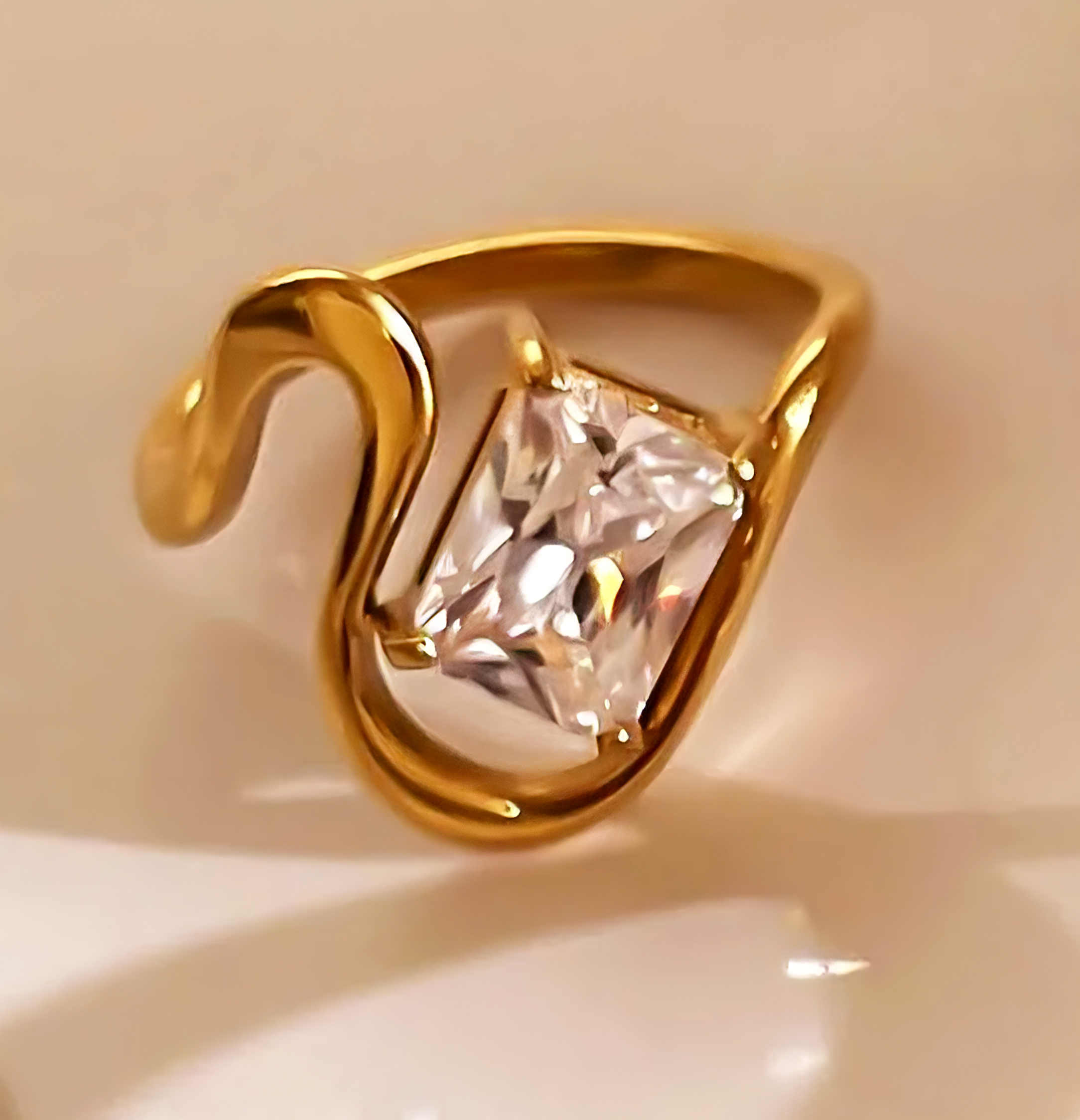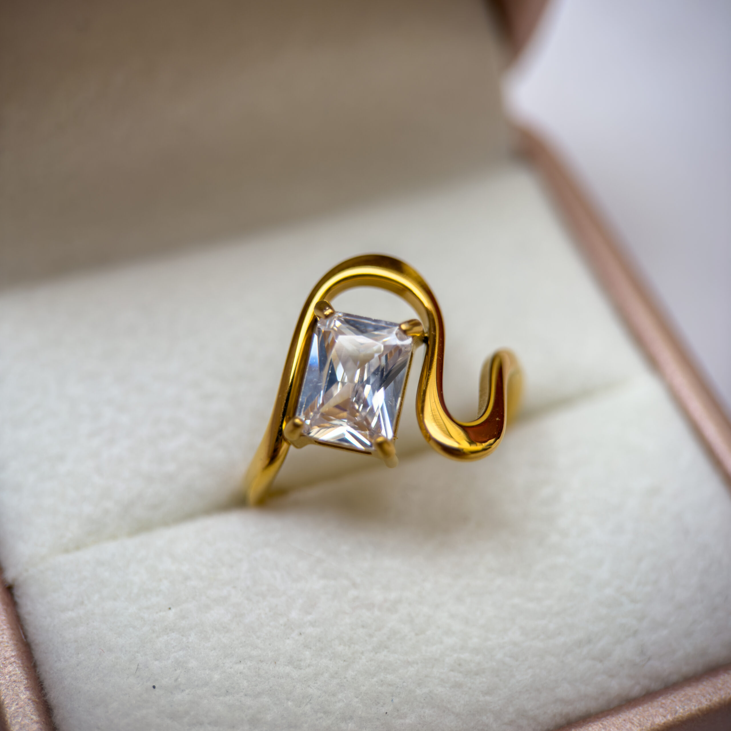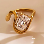 El Anillo Destellos cautiva con su imponente zirconio de corte rectangular enmarcado en una banda dorada de ondas fluidas y artísticas. Es la pieza protagonista ideal para quienes buscan combinar elegancia clásica con un toque vanguardista y moderno.